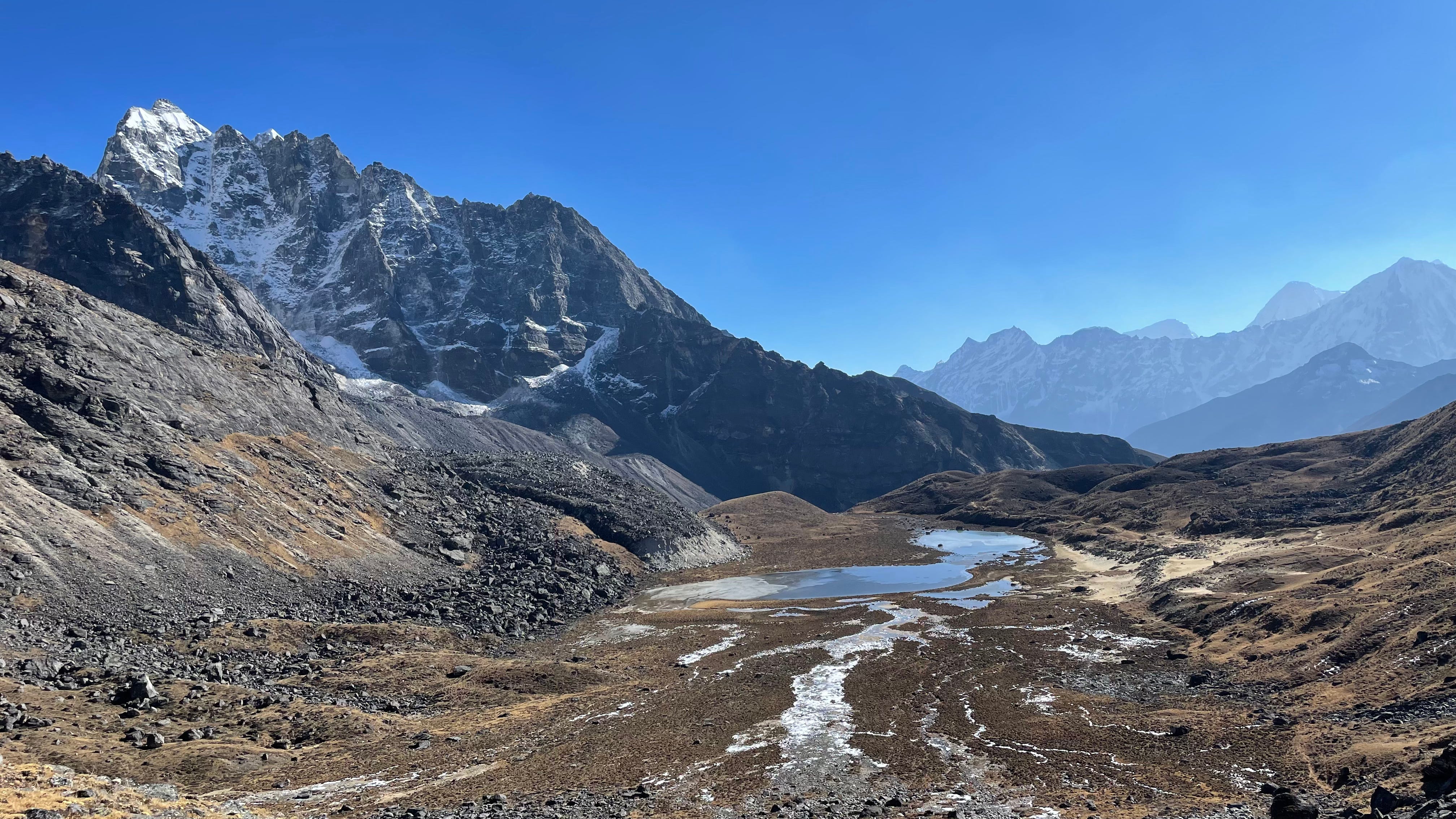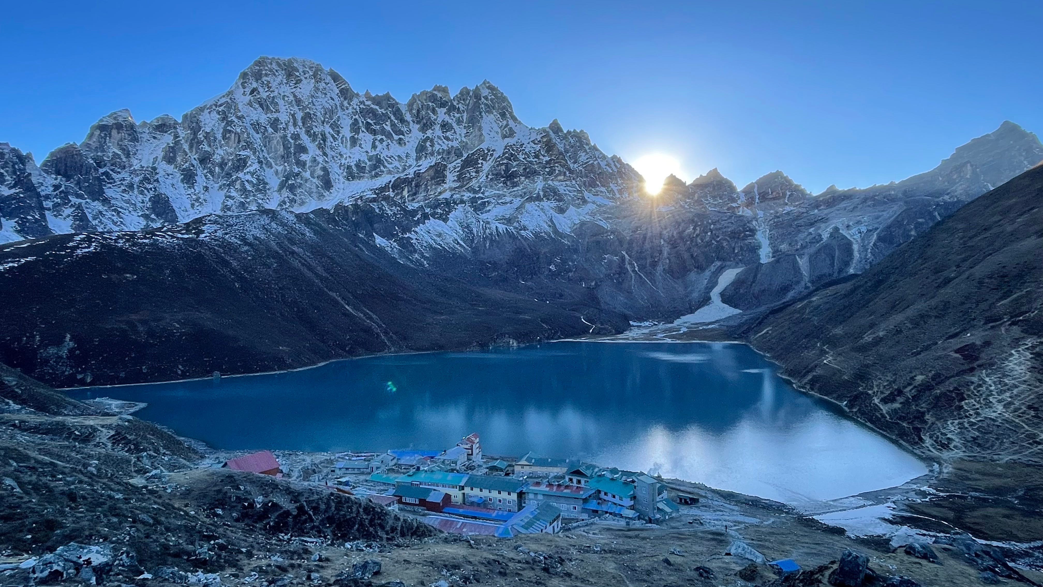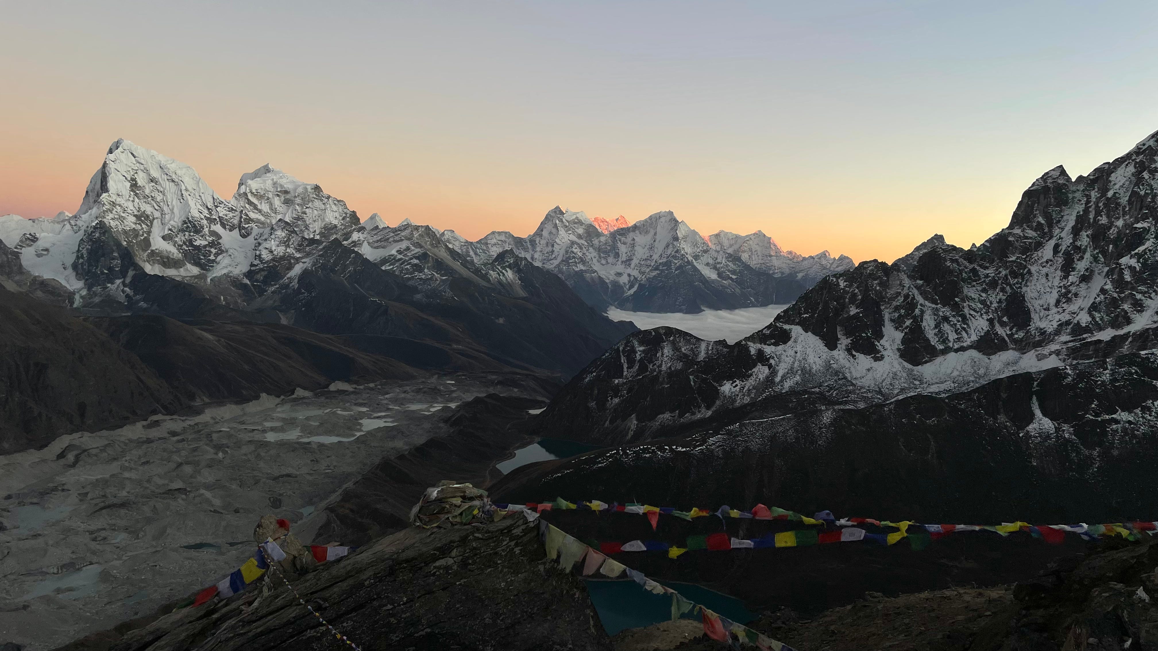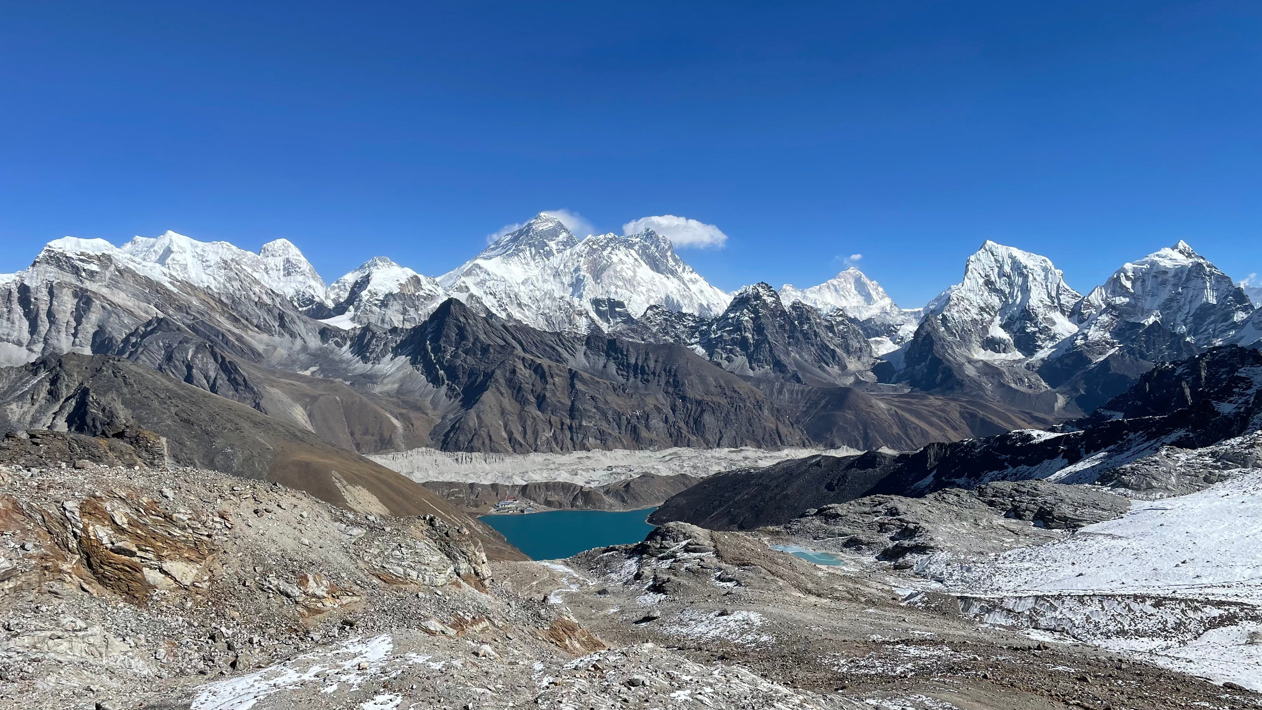 The steady and protective Cho Oyu looked down over our new valley, while raw and rocky peaks stood on either side of us and a river meandered far below. On our sixth day, we reached the furthest point of our trek, the village of Gokyo (4,700m/15,584ft). We spent two nights there, situated right between the Ngozumpa glacier (the longest glacier in the Himalayas), an opaque green lake, and peacefully slumbering snow-capped mountains.