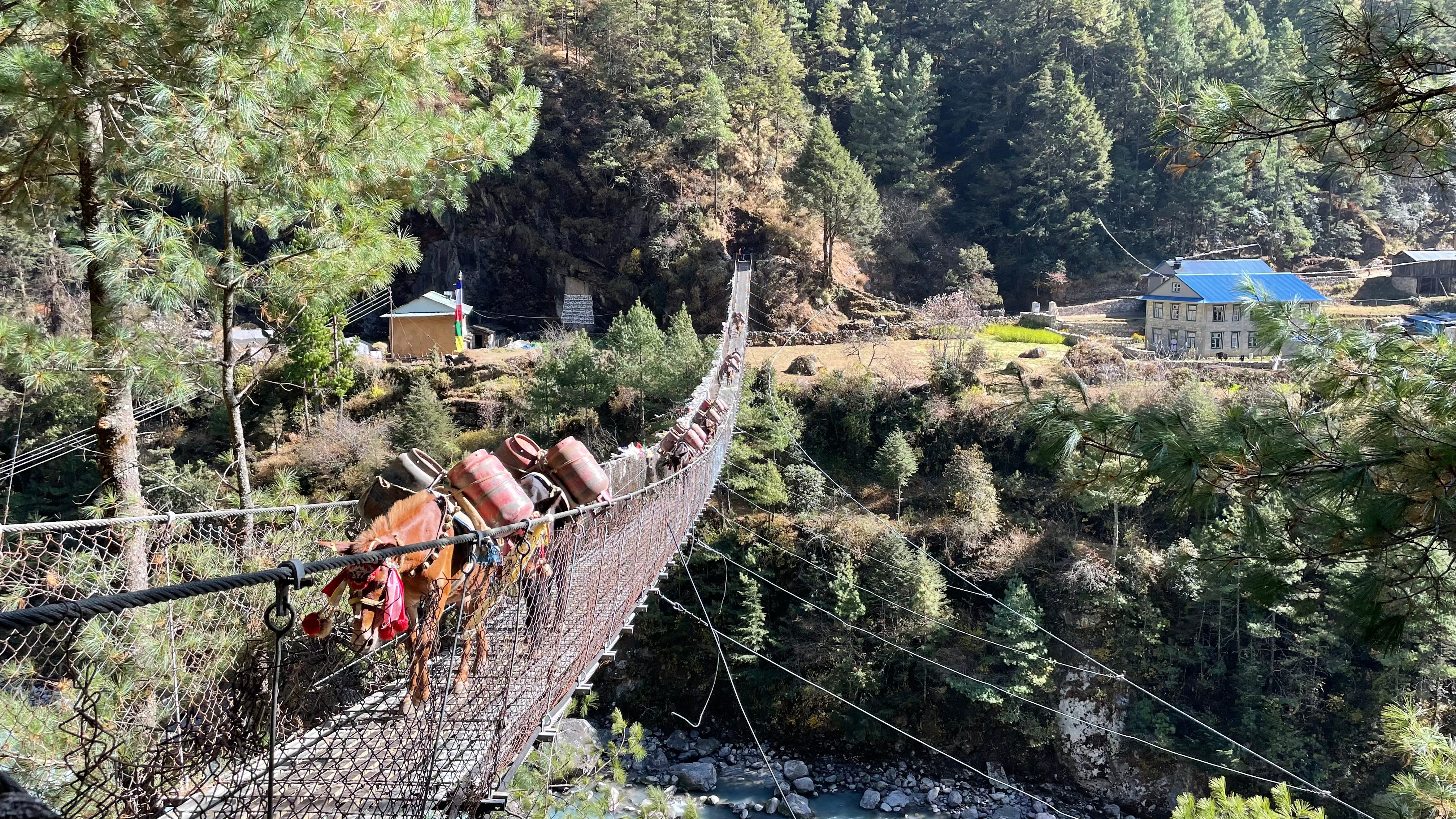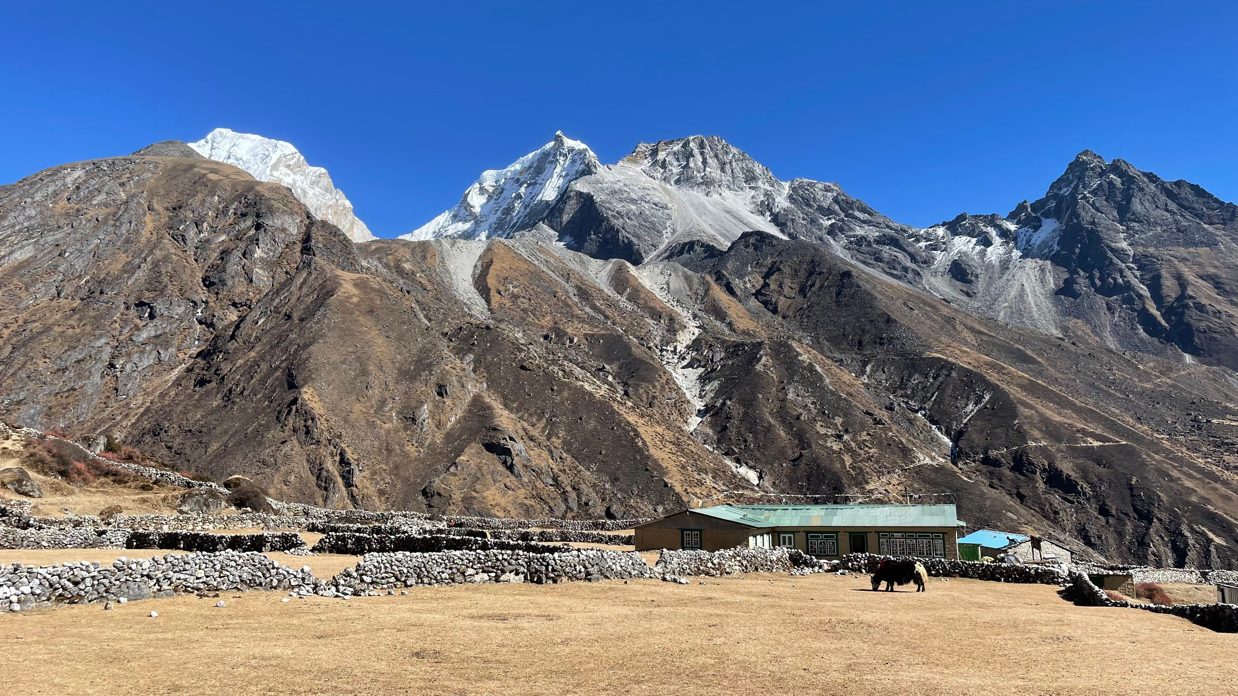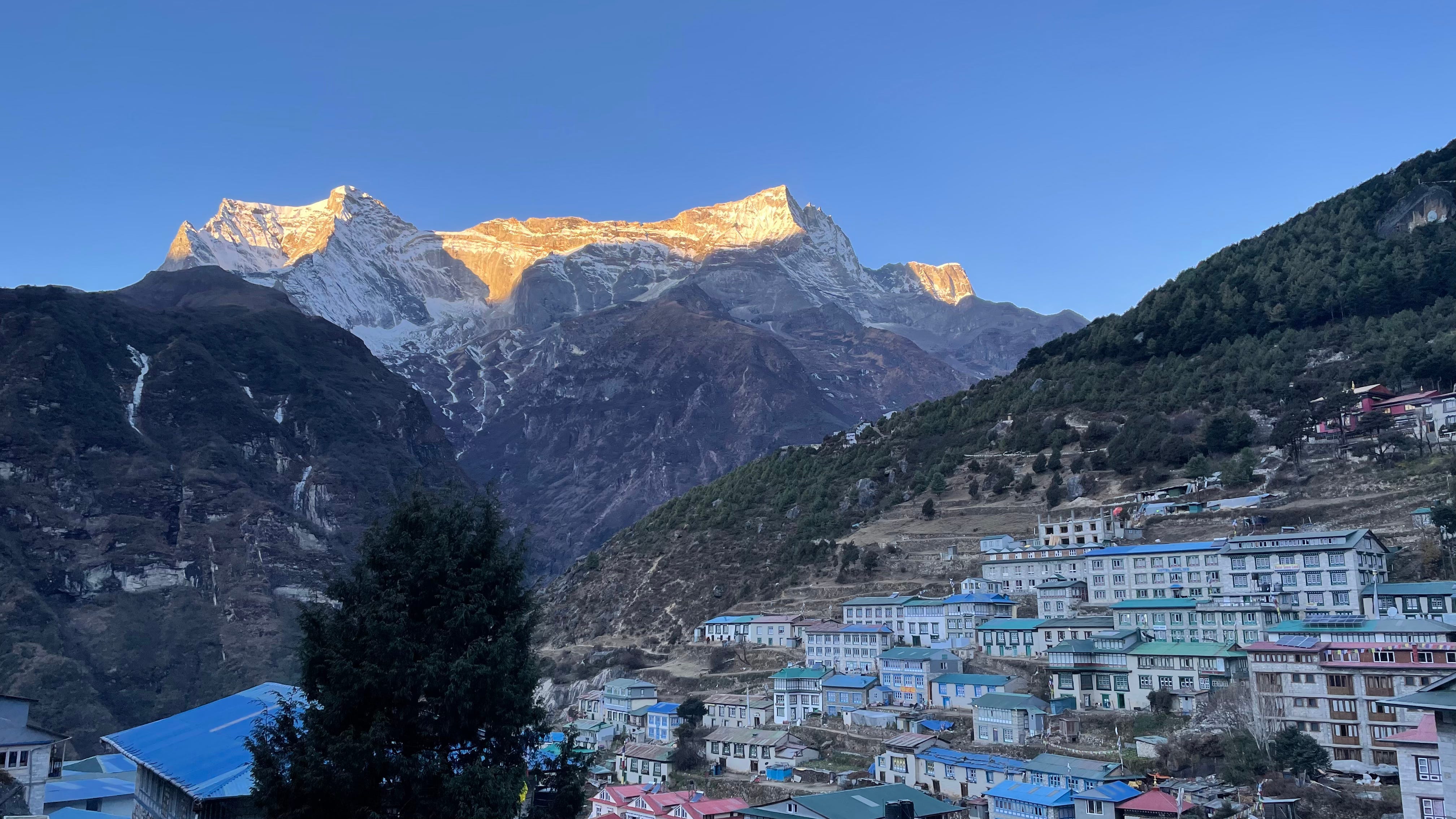 After two days of walking, we entered the national park and climbed up to Namche Bazaar, a large and picturesque settlement which functions as the hub of the surrounding Khumbu region. The town was filled with an odd combination of locals going about their business, in shops and homes and a school which brings many students from nearby villages, and the unmistakable heavy-handed touch of tourism, hotels with hot showers and sofas, coffee shops with espresso machines, bars serving Guinness and projecting World Cup games at 3,440m (11,286ft). We took a valuable day there to rest and acclimatize, and walking through the streets we saw closed hotels and stores, empty streets and restaurants, clear signs of the end of tourist season, or perhaps the still-legible signature of Covid.