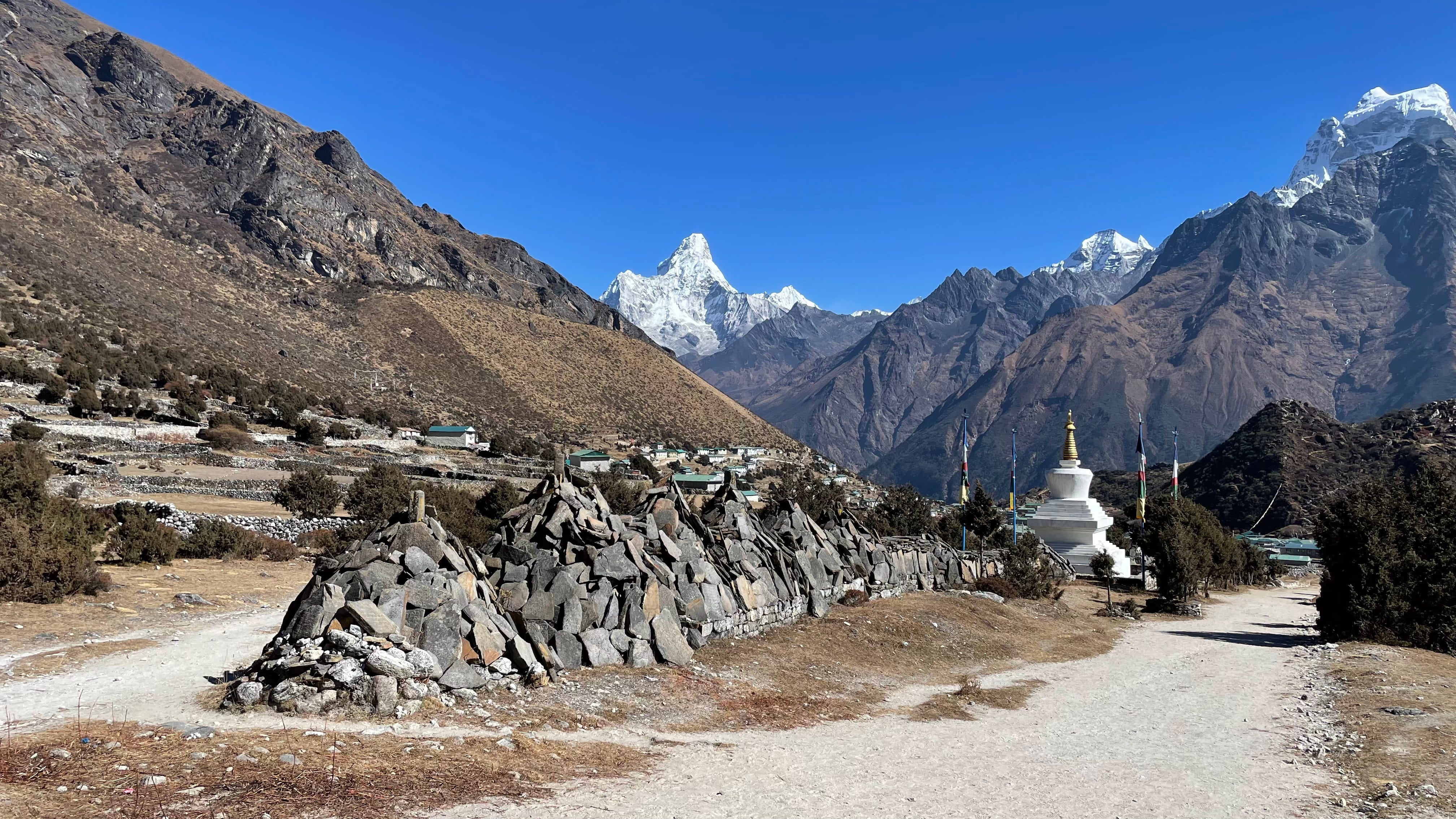 On our way out of Namche, we carved along the side of the valley by iconic stupas looking up at the striking Ama Dablam and Sagarmatha peaks. Then, our eyes peering skywards, we peeled off into a different valley and left behind the crowds headed towards base camp, slowly starting to make our way up out of the trees and onto the windswept terrain above.