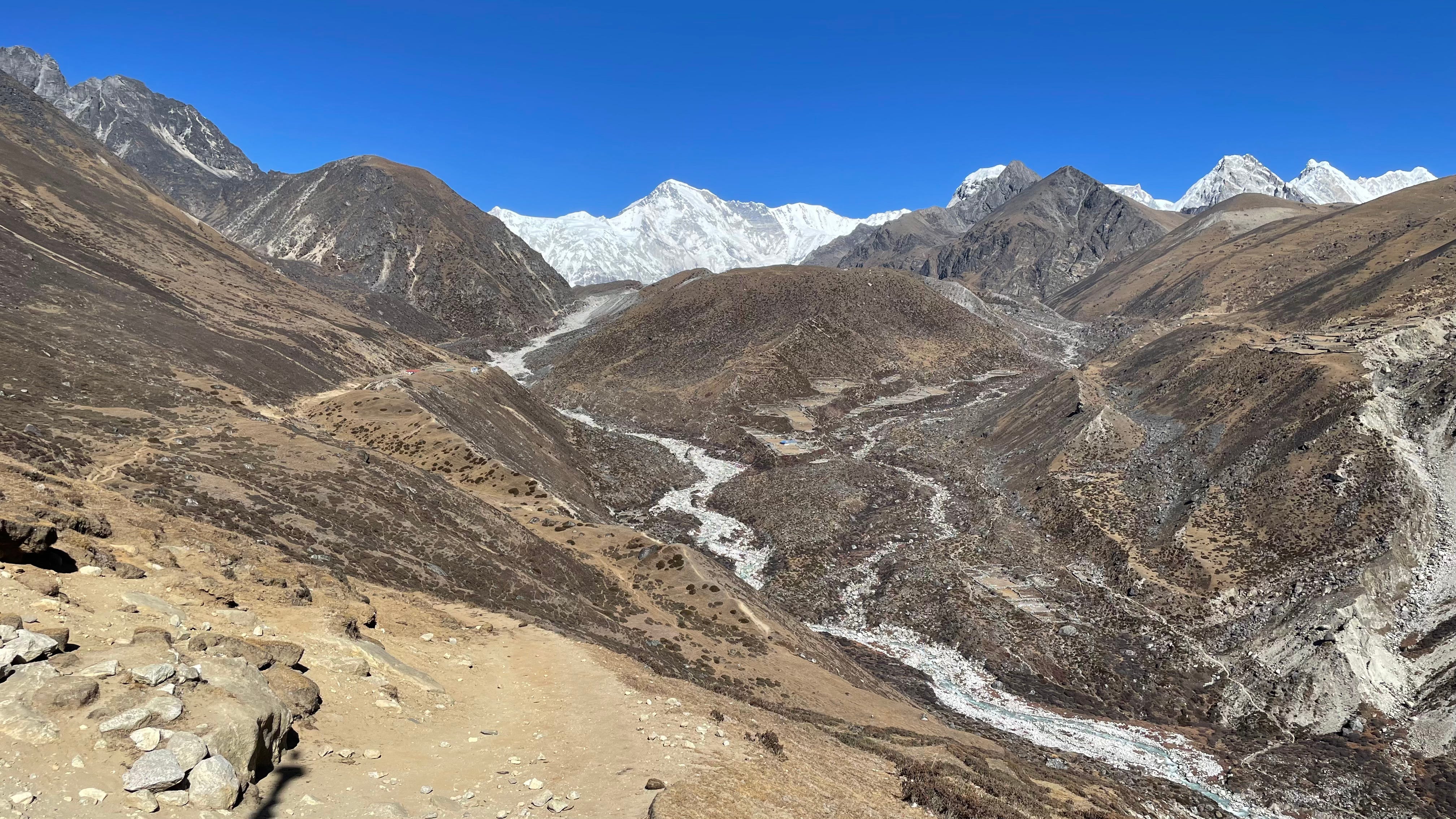 We moved slowly on the way up, adjusting to the altitude as we went, since we had started off at relatively low elevation (for the Himalayas, anyway). David had come directly from sea level, and even though I had a slight head start in Kathmandu, we both had to take it easy as the air got thinner. From Gokyo, we day hiked to Gokyo Ri, a lookout over the town offering views of Chomolungma, Lhotse, Makalu, and Cho Oyu, four of the highest mountains in the world, and the high point of the trek at 5,360m (17,585ft).